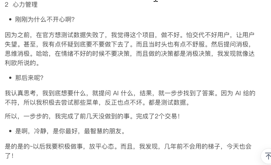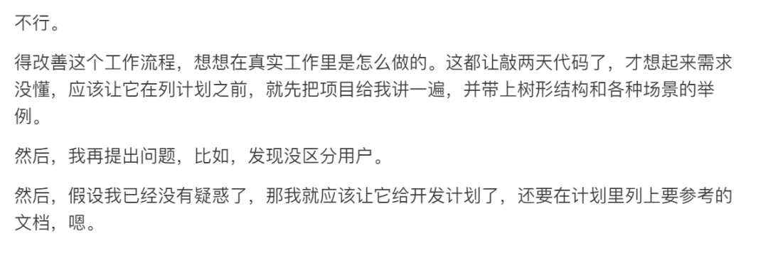 Solved the conversation flow problem with AI. Don't bring up development until the requirements are fully understood. Once you jump into development planning, you'll write tons of redundant code. It's the same as at work — 9 years as a programmer built invisible but invaluable experience.