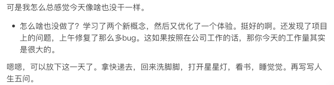 I clearly did a lot during the day, but at night it still feels like I did nothing — what do I do? Review the day's TODO list, see what was accomplished, mentally close out the day, then go to sleep. Yes, health matters too.