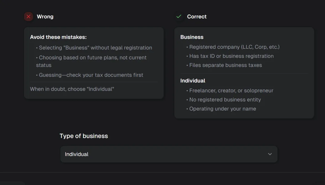 - I chose individual because I don't have a registered company.