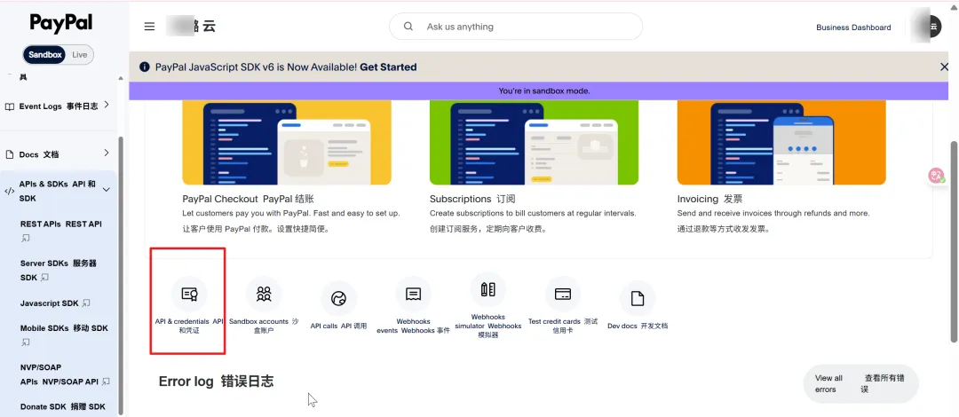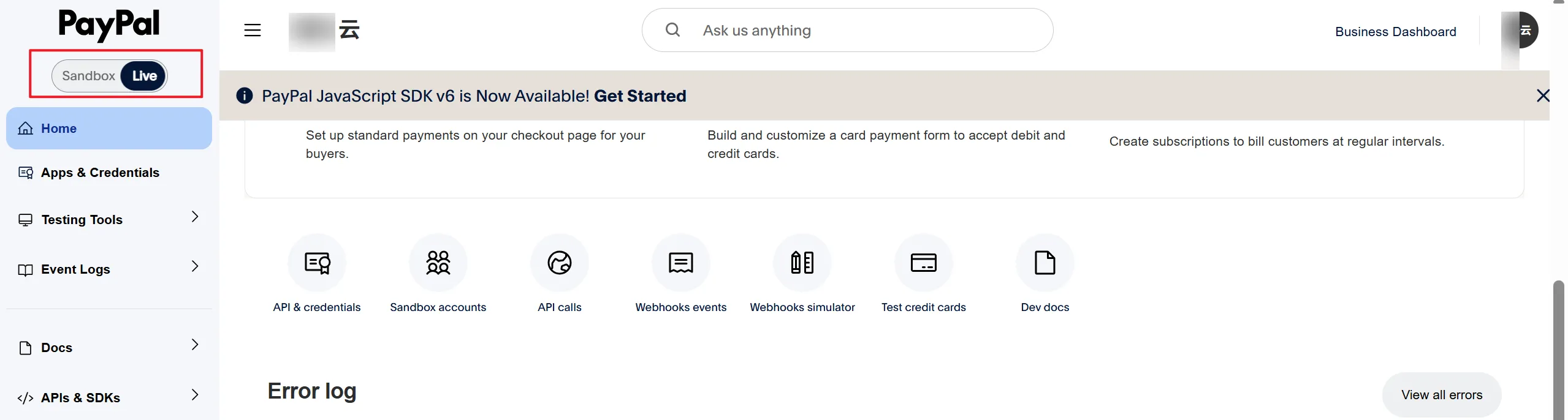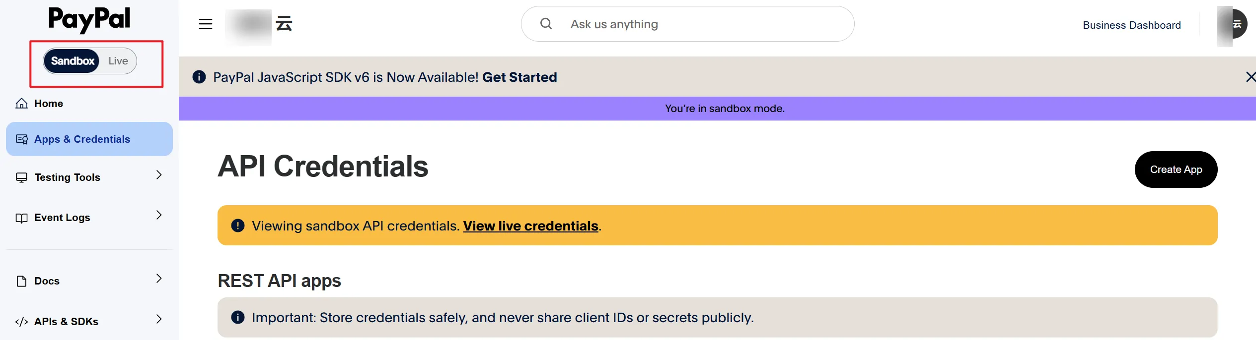 Register for a developer account at https://developer.paypal.com and enter the dashboard at https://developer.paypal.com/dashboard.