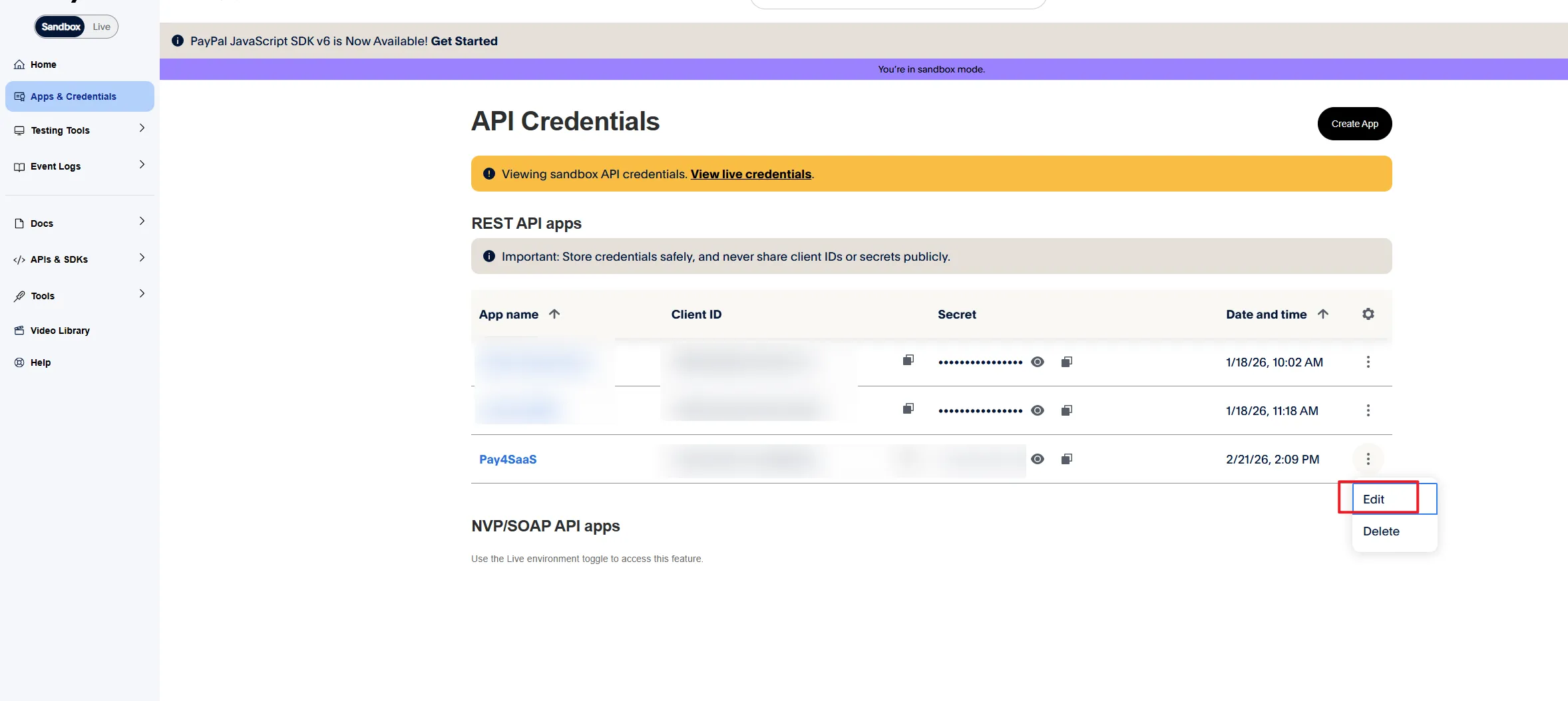 How to get it? Go back here: https://developer.paypal.com/dashboard/applications, and click Edit.