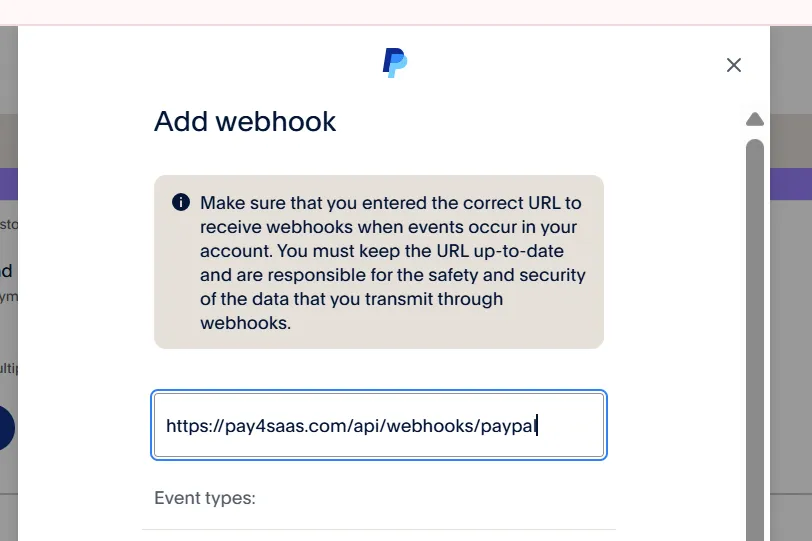 For URL, fill in https://yourdomain.com/api/webhooks/paypal.