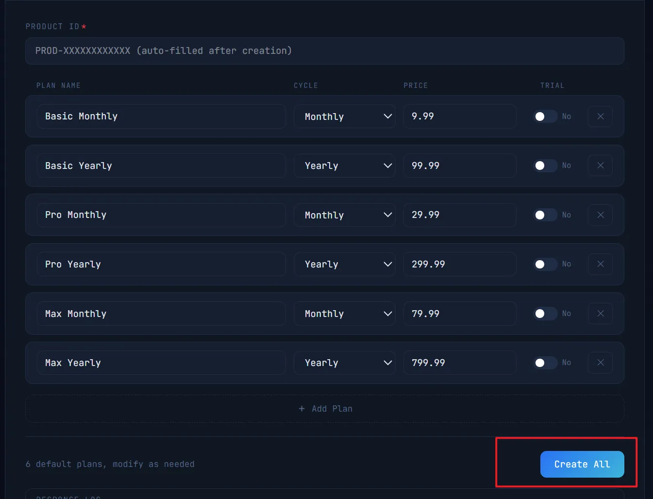 Batch create Plan products. Fill in the name, select the period, fill in the price, and if there's a trial, fill in the trial days, then click Create All. By default, it will batch create Plans based on the Product ID. It depends on your project, but typically there are monthly/yearly pairs.
