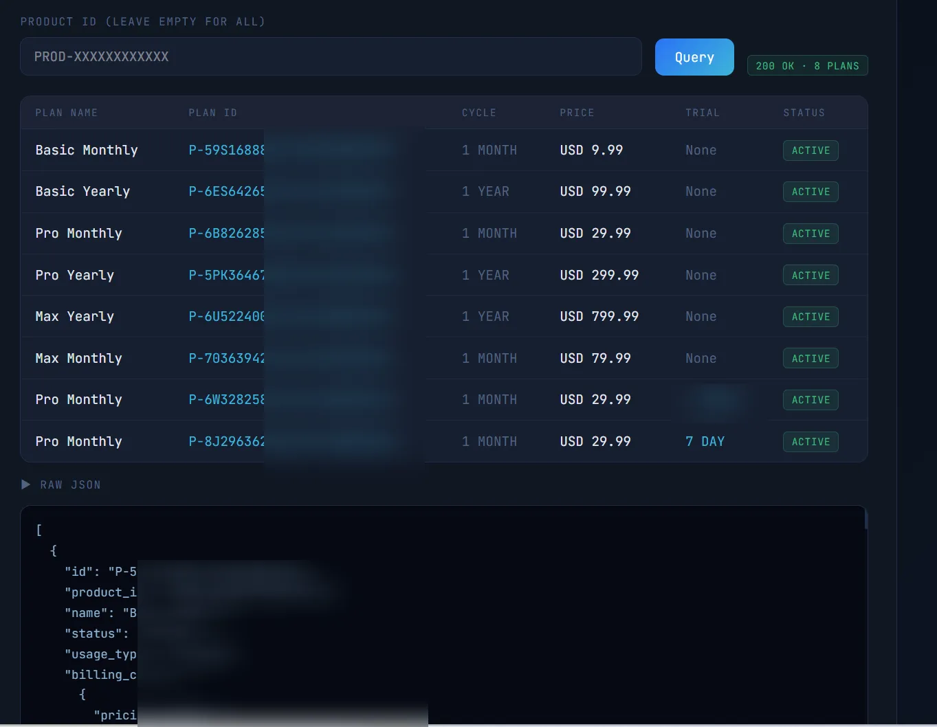 - After successful creation, query to check if they were created correctly. Each Plan will have a corresponding