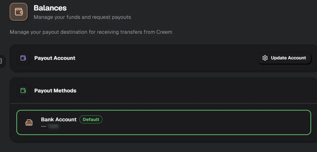 在这里设置。https://www.creem.io/dashboard/balances/accounts