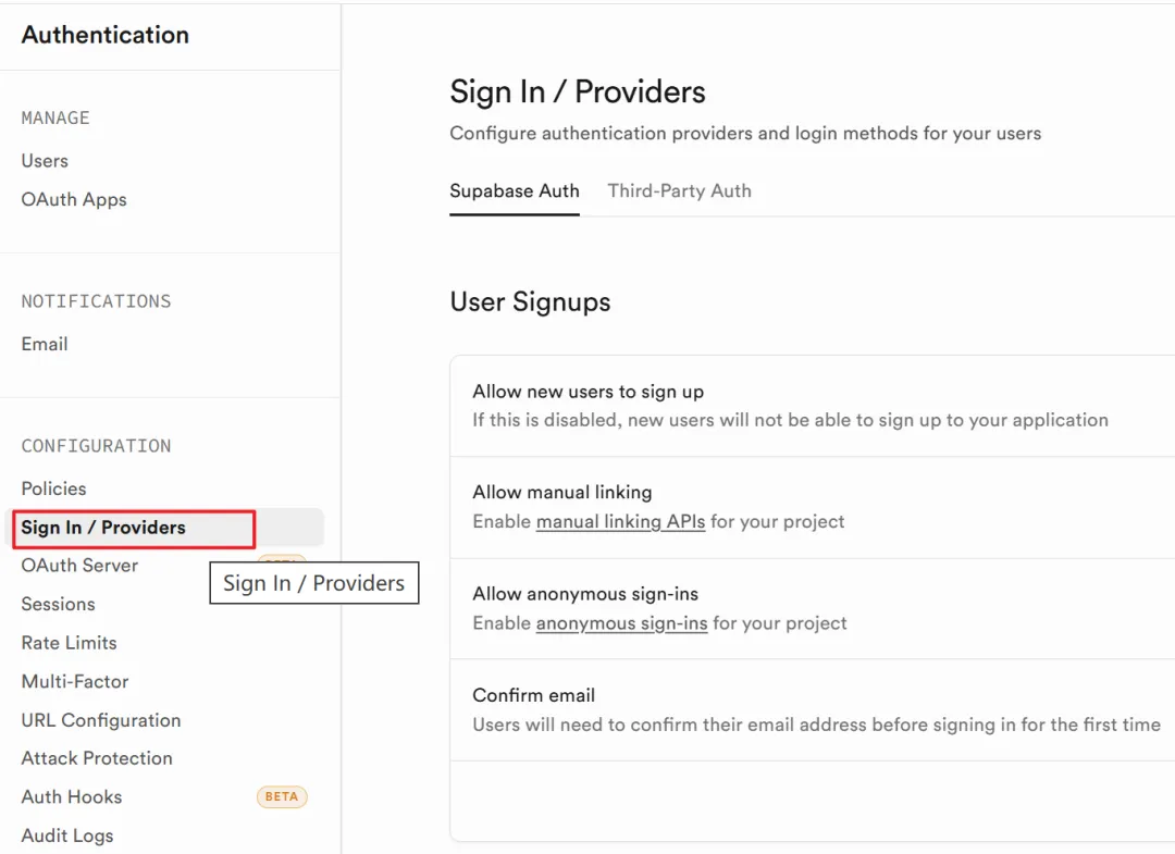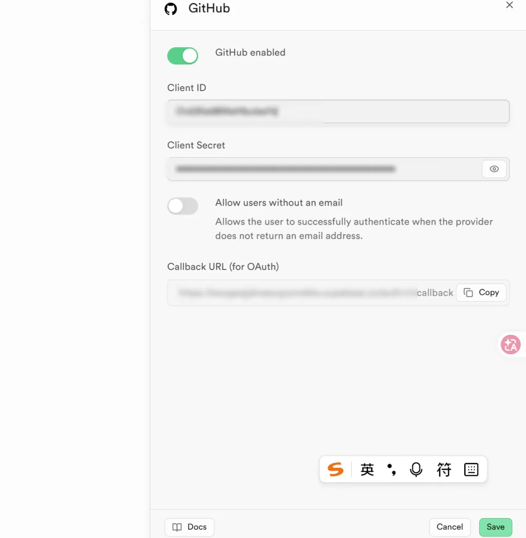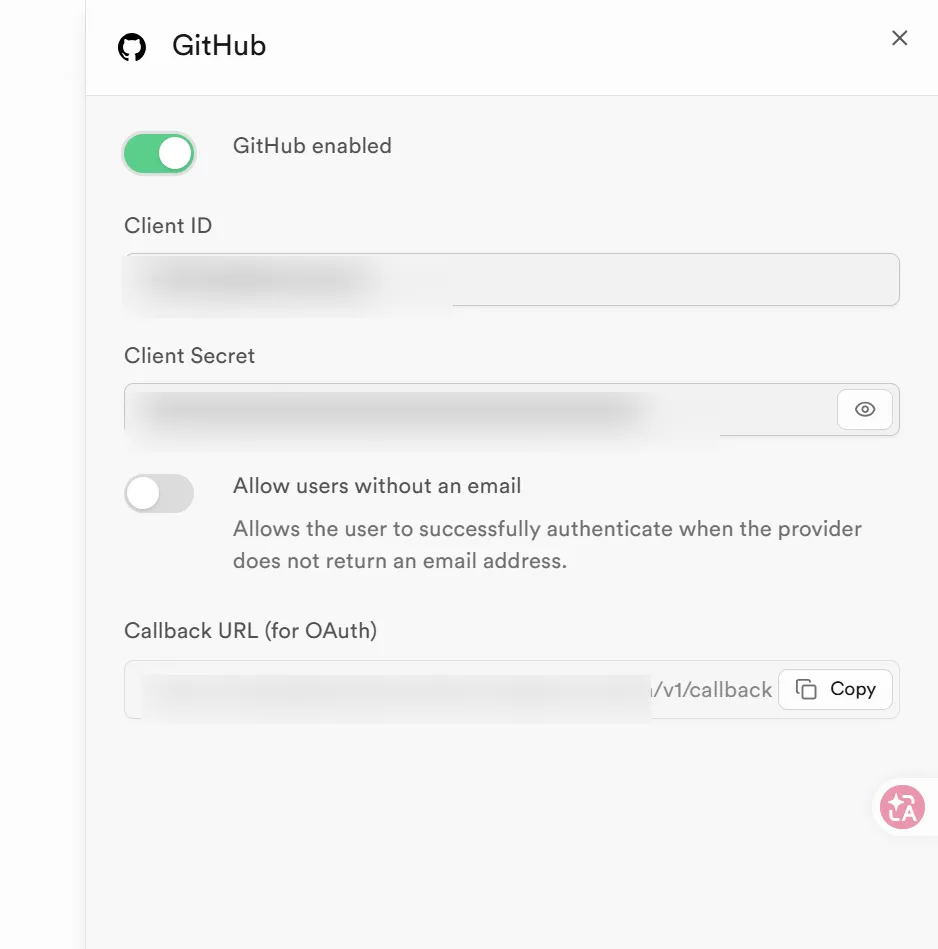 Go back to the GitHub configuration page in Supabase and enter the Client ID and Secret.