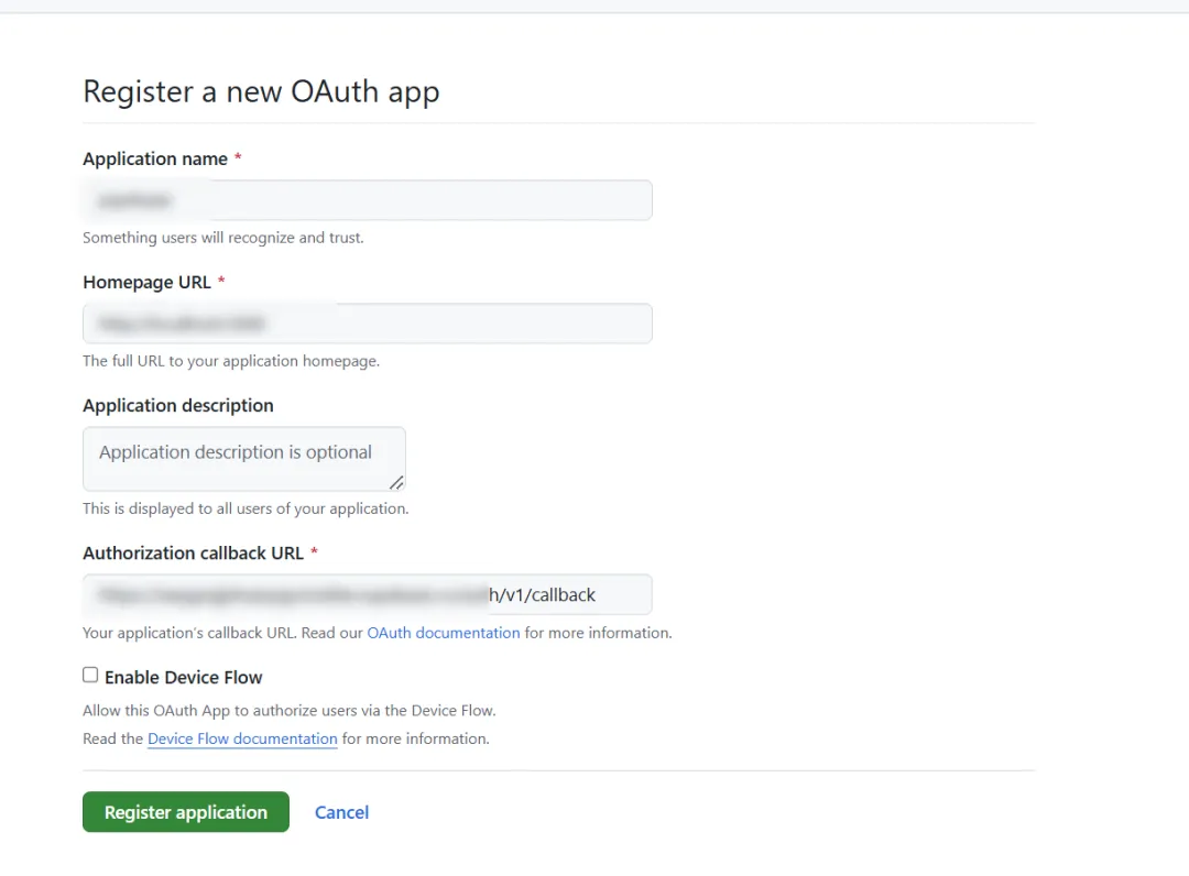 Fill in the application name; for the URL, just use the development environment URL, the redirect is not related to it and is controlled in the code; for Callback URL, use the one you just saw in Supabase.