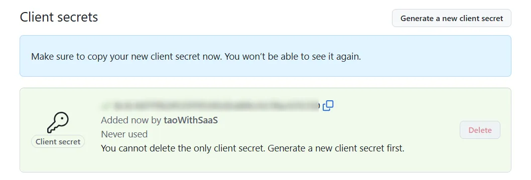 Copy the secret promptly, as the prompt above says it's only shown once, otherwise you'll have to do it all over again.