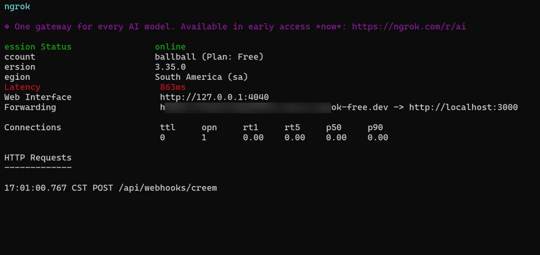 Use ngrok — a tunneling tool that temporarily exposes your local service to the public internet so payment providers can reach your Webhook endpoint. The free tier includes 20k requests/month, more than enough for development.