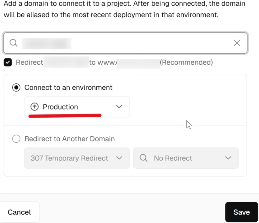 - Enter the purchased domain, and select production environment below.