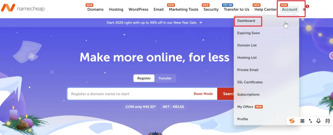 - Open Namecheap and go to the dashboard panel.