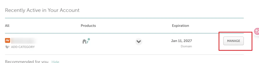 - Find our domain and click Manage.