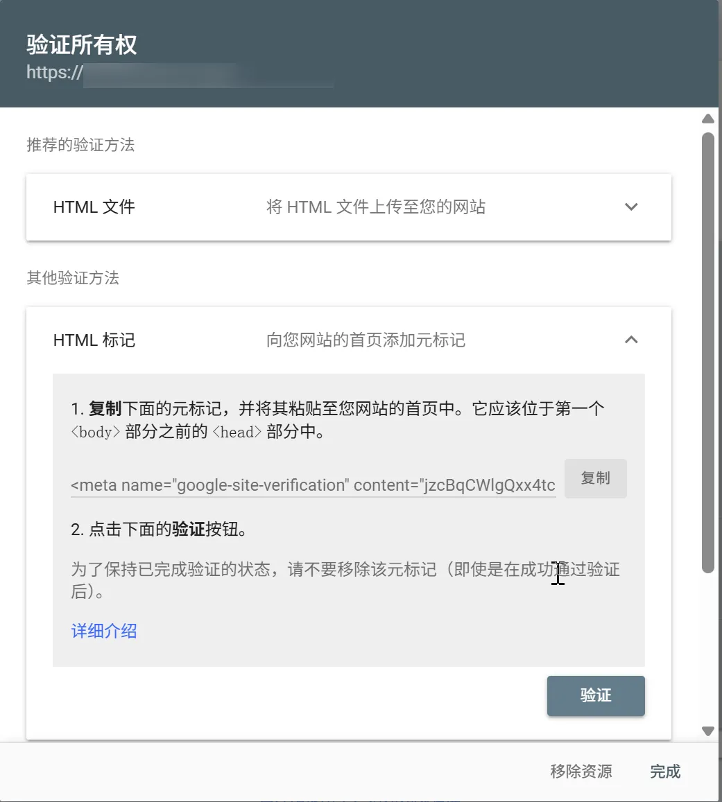For verification, use the HTML tag method — it's the simplest. Click copy.